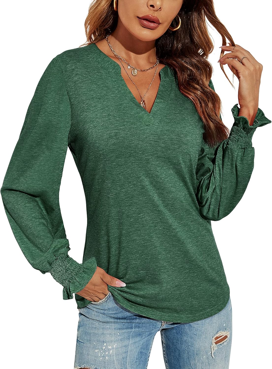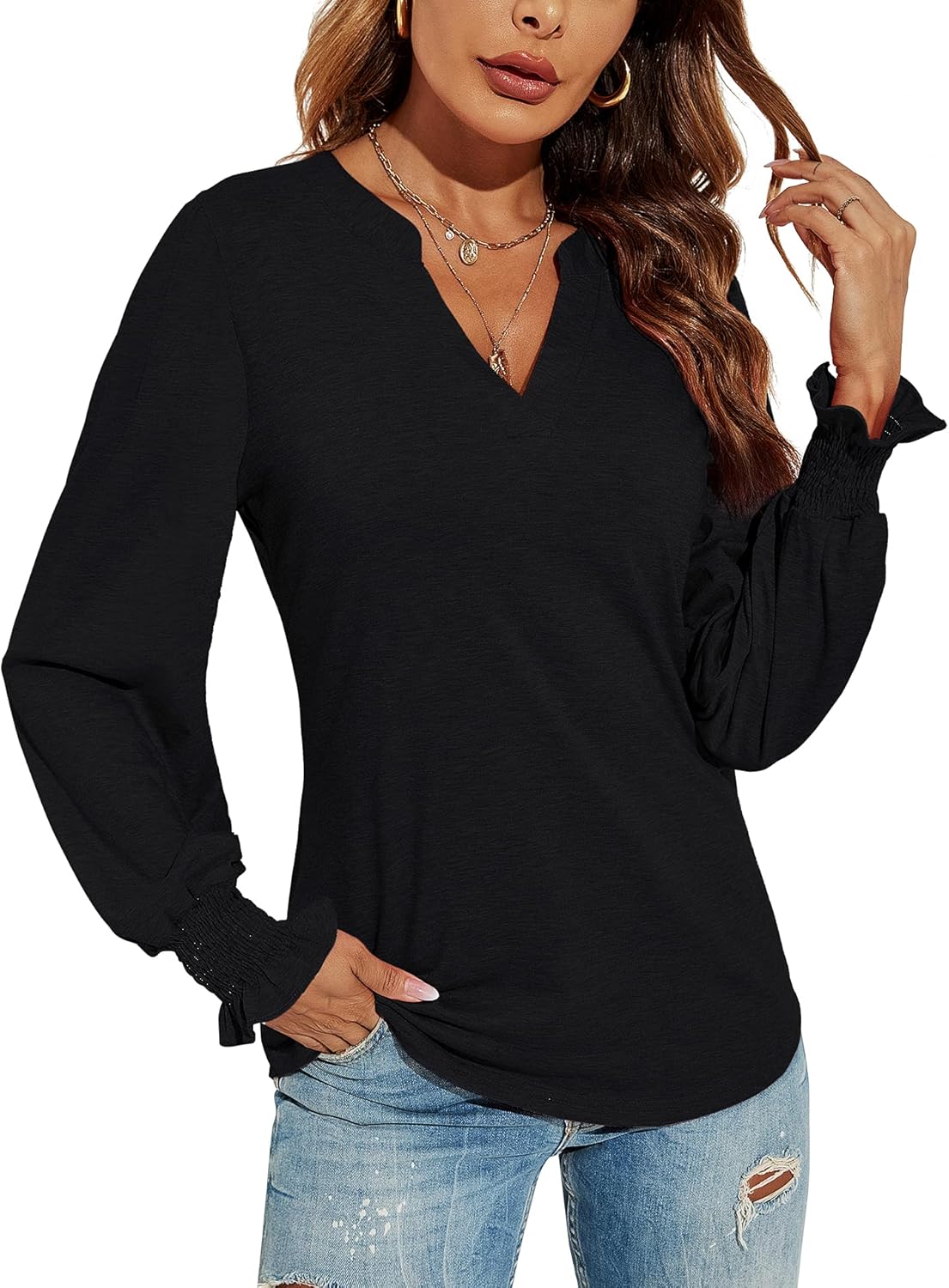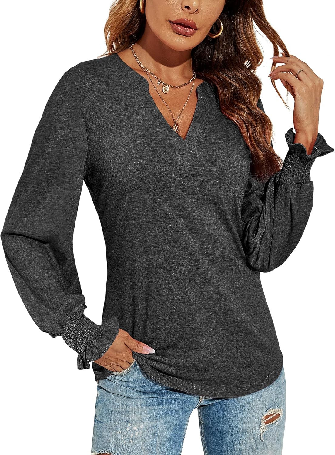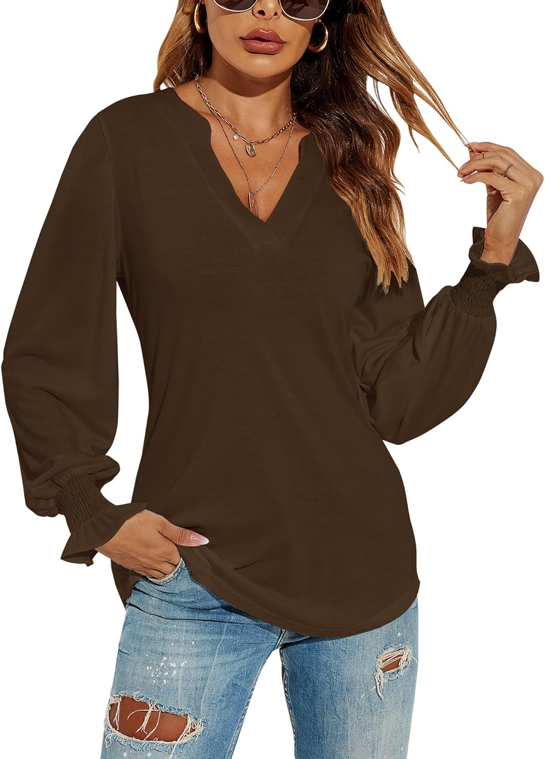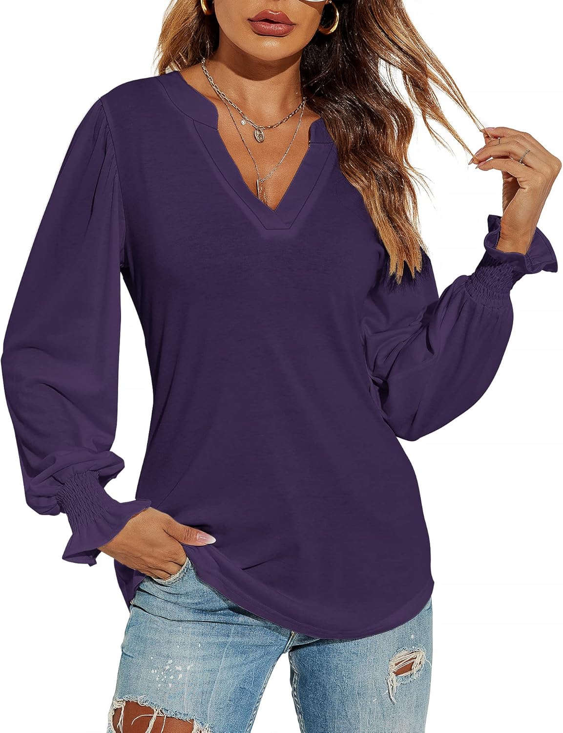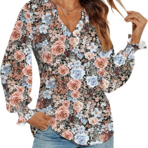 Romanstii Women's Casual V-Neck T-Shirts Loose Puff Long Sleeve Tops Tunic Blouses quantity