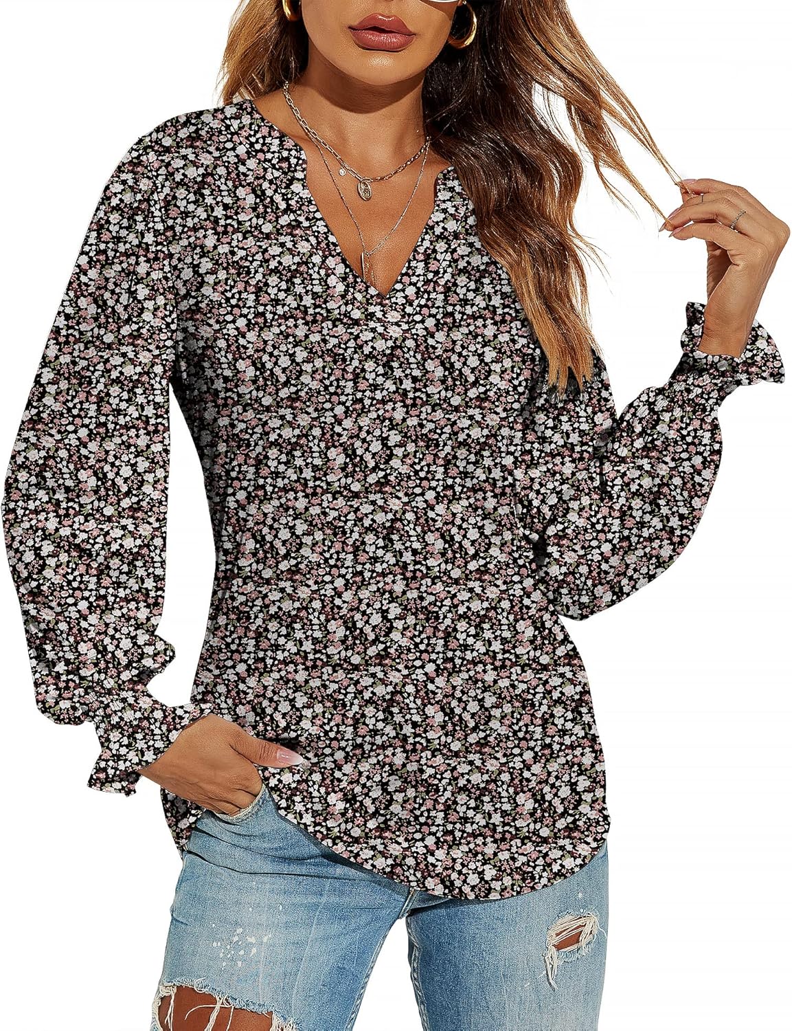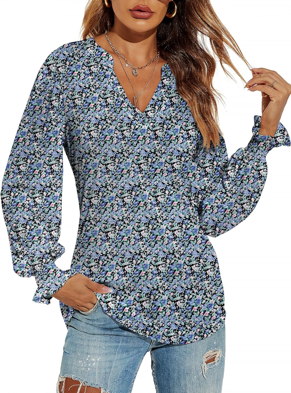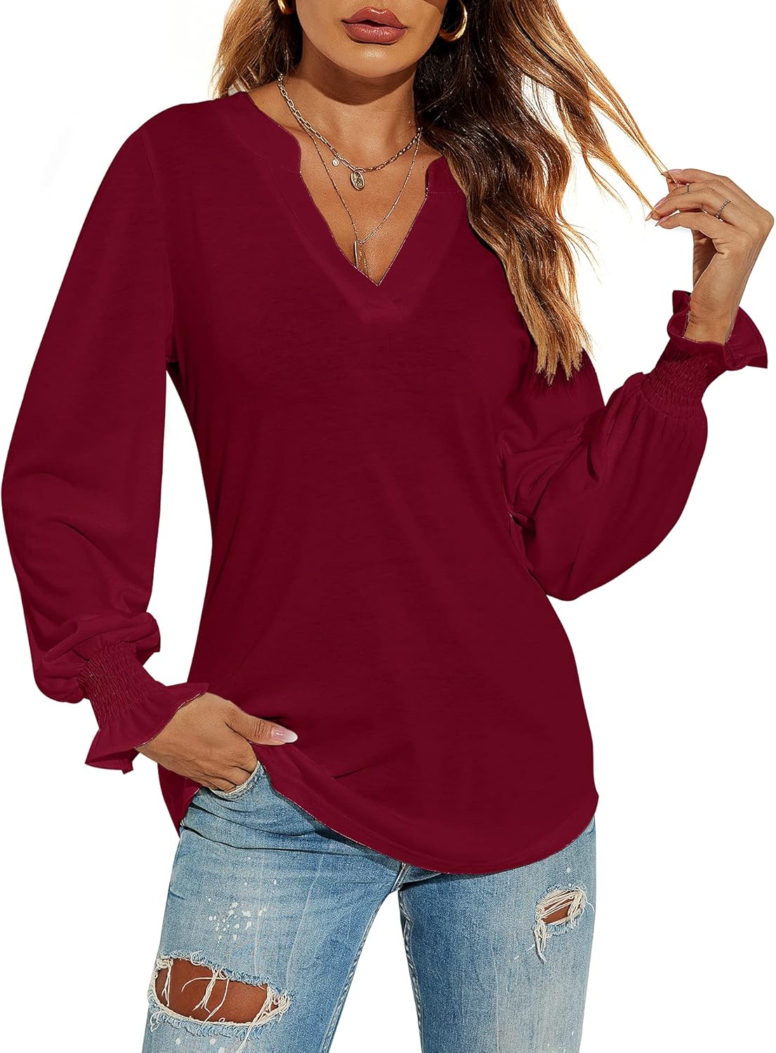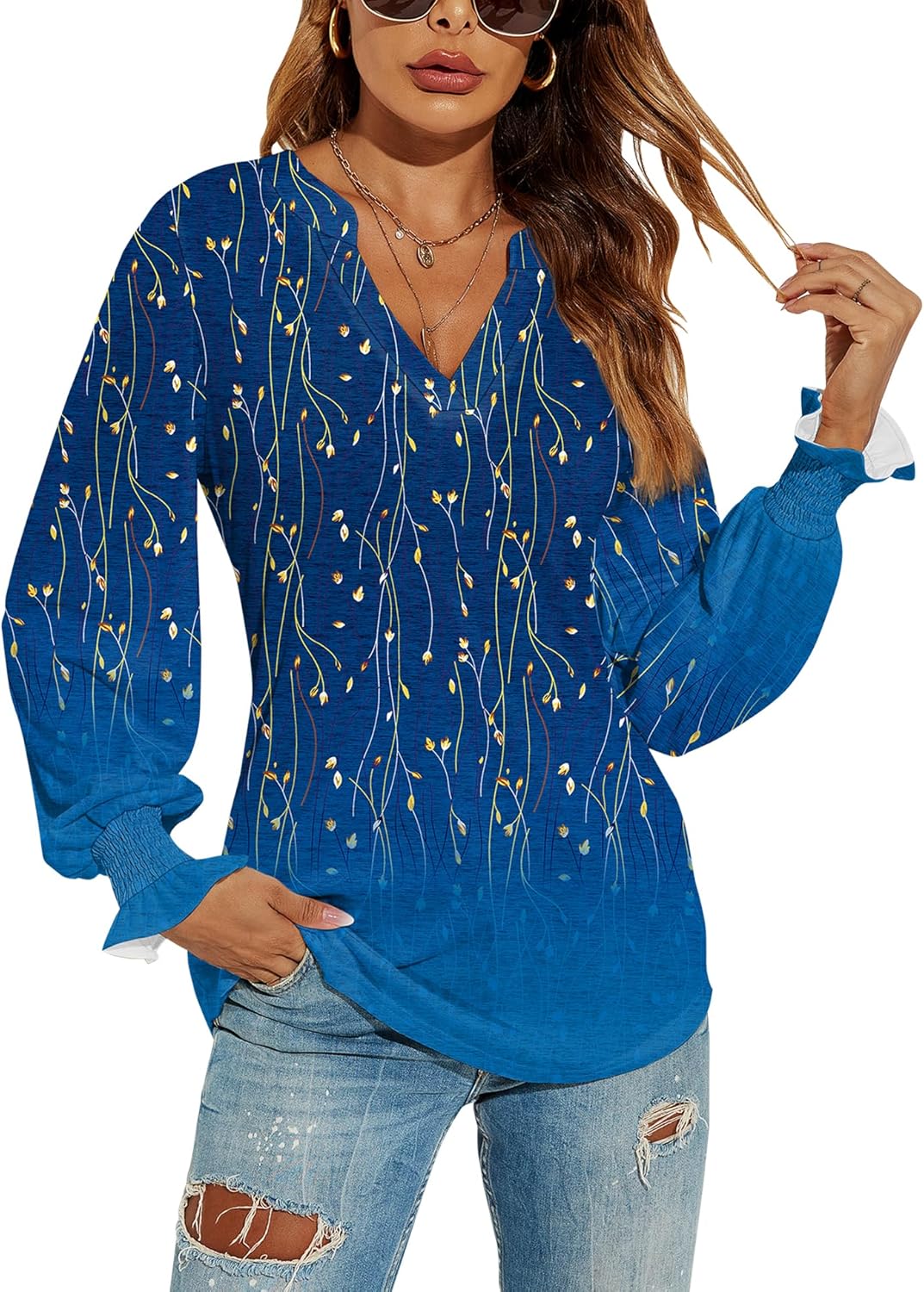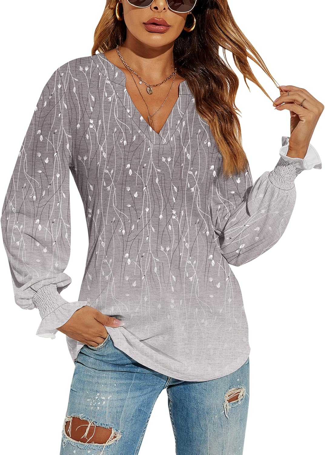 Romanstii Women's Casual V-Neck T-Shirts Loose Puff Long Sleeve Tops Tunic Blouses quantity