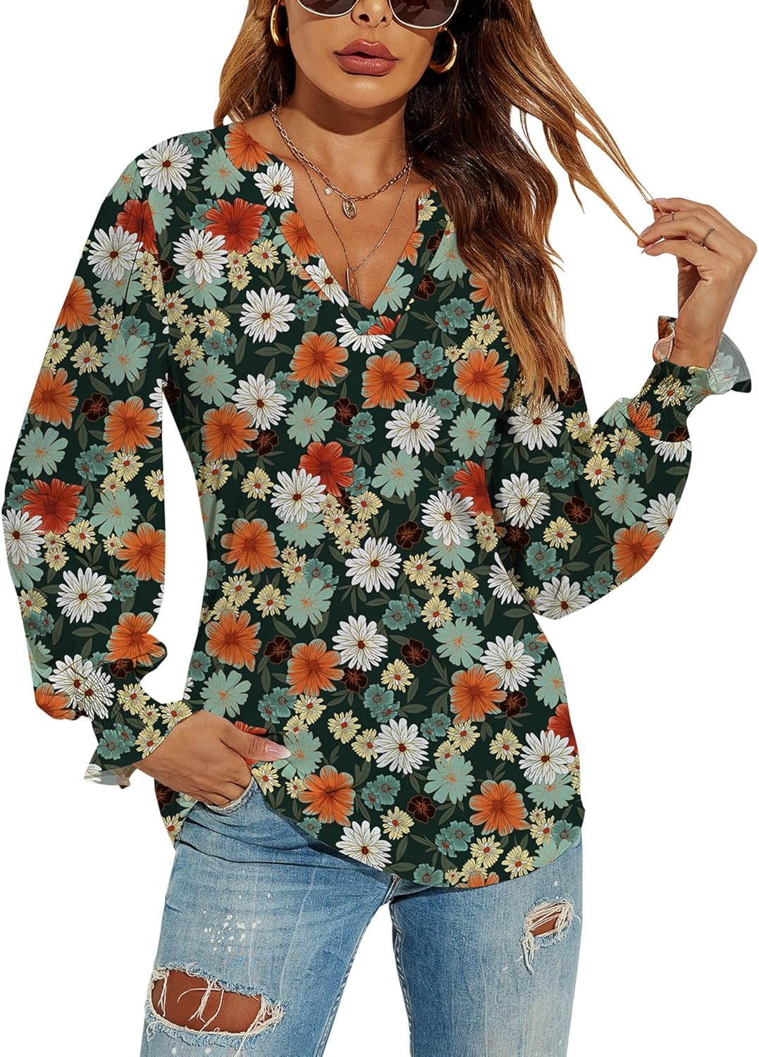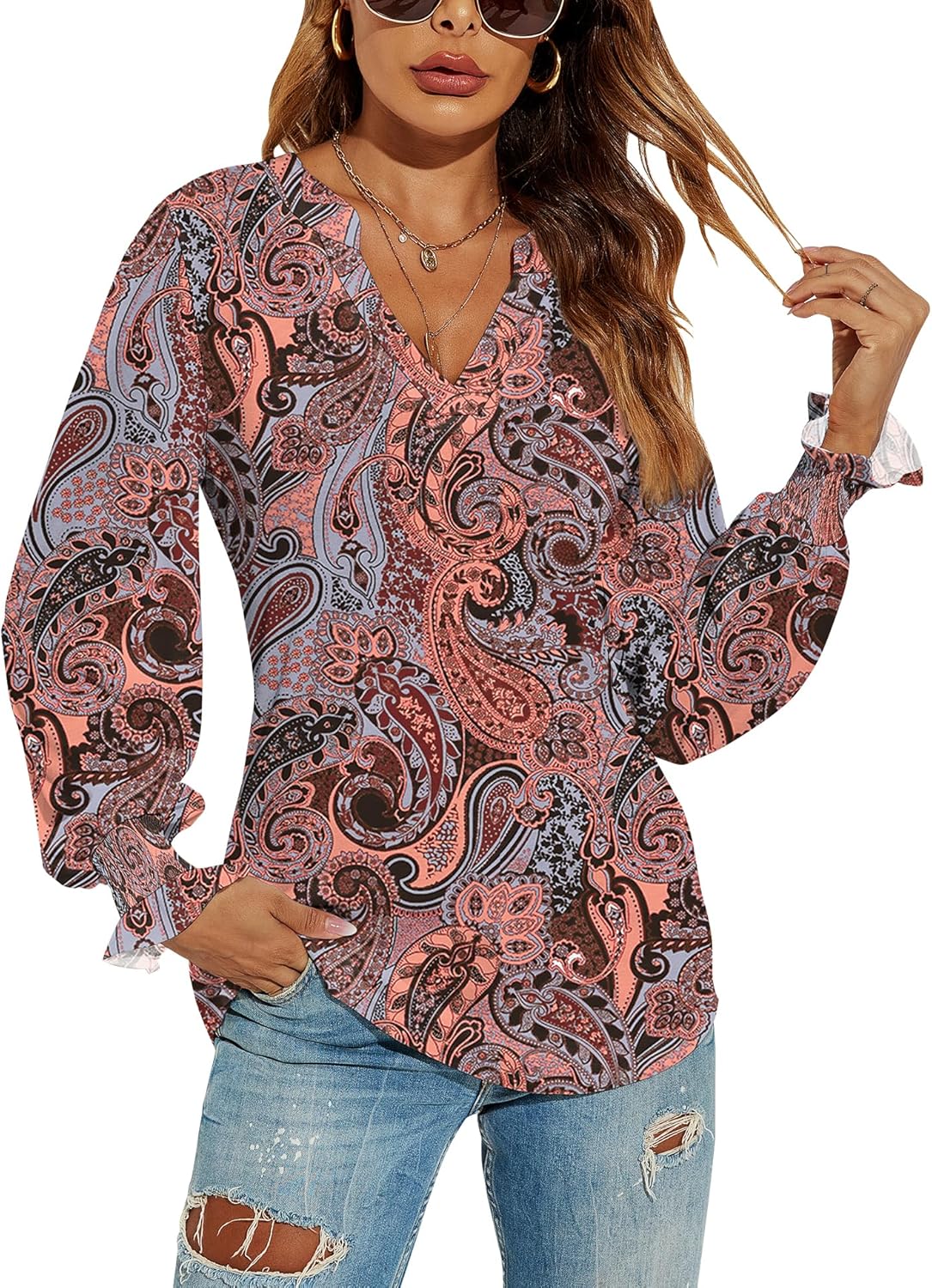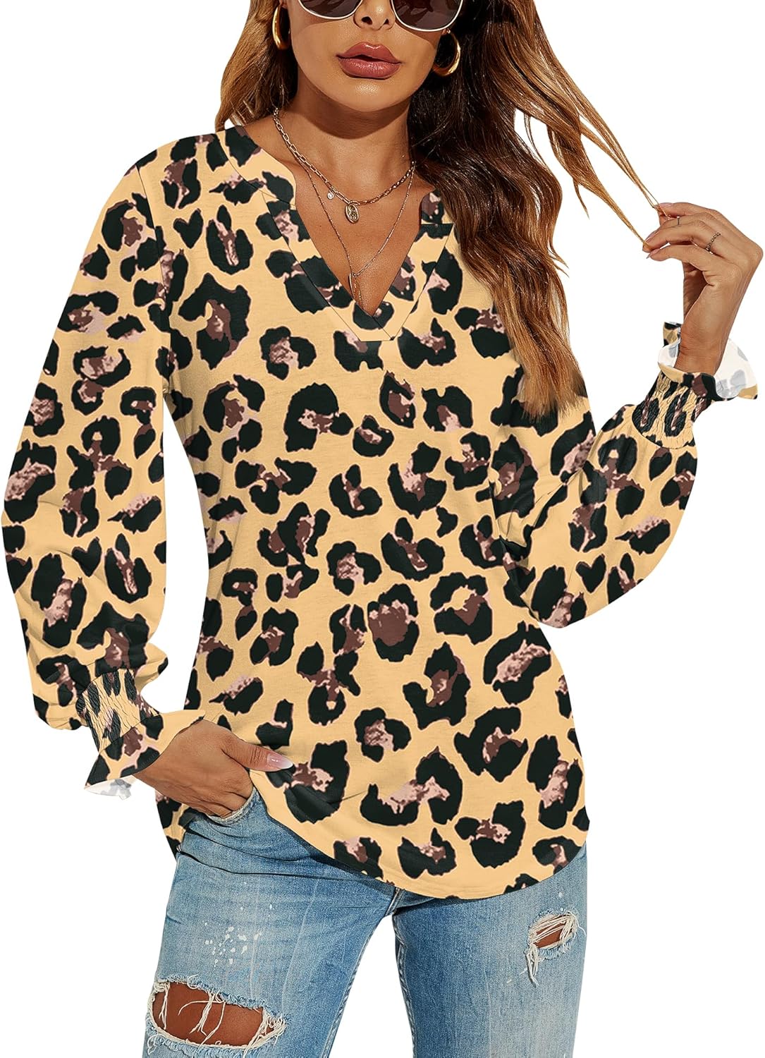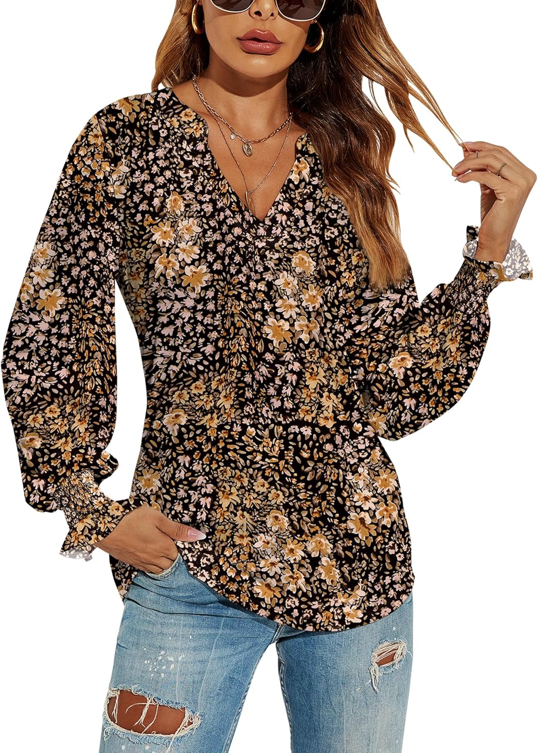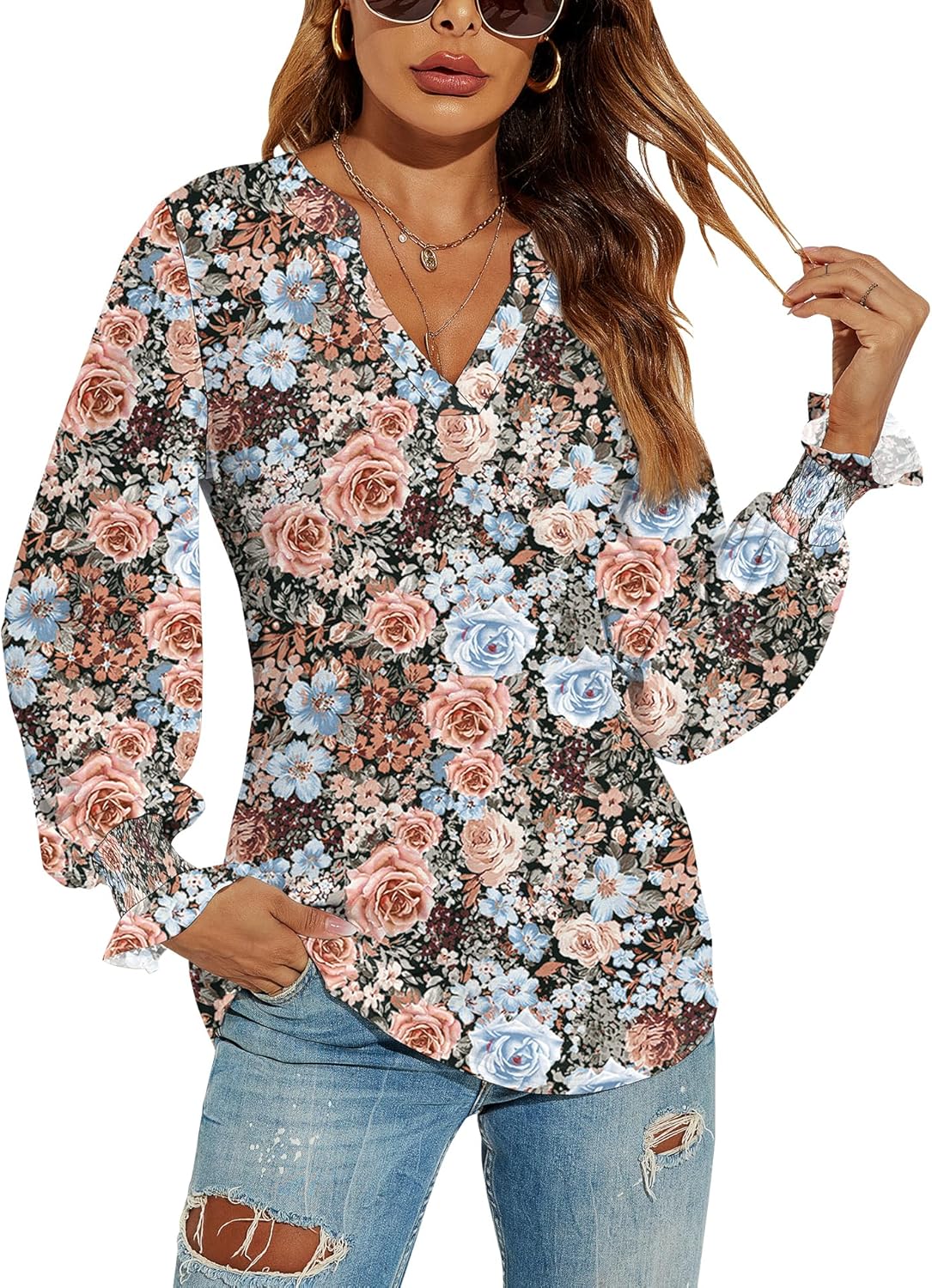Romanstii Women's Casual V-Neck T-Shirts Loose Puff Long Sleeve Tops Tunic Blouses quantity