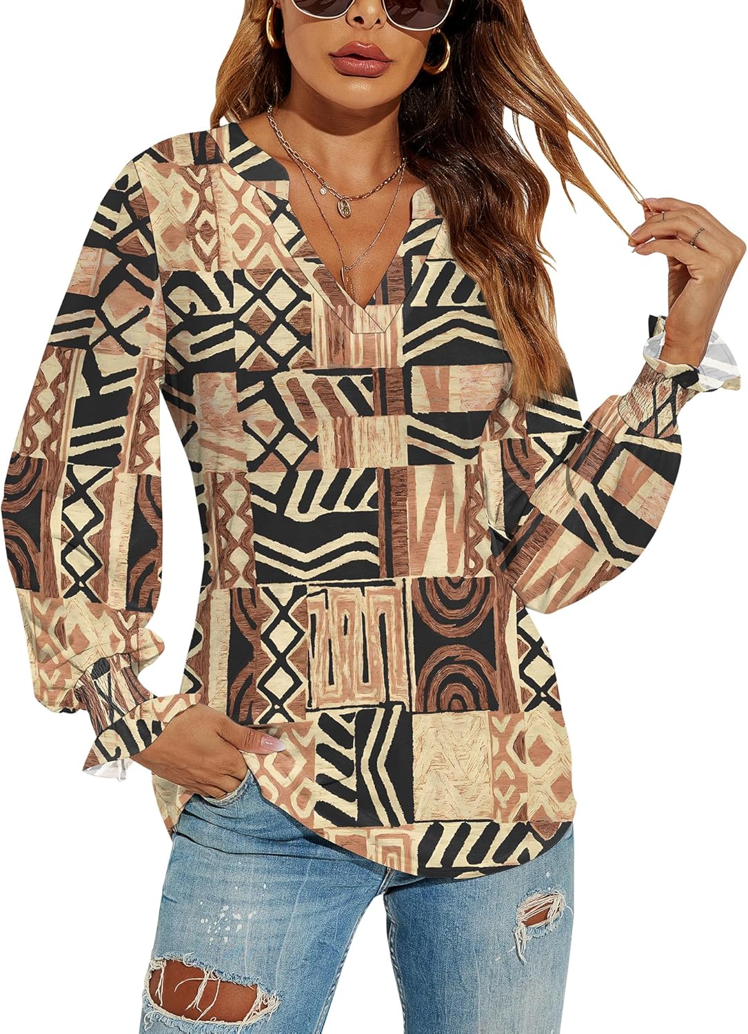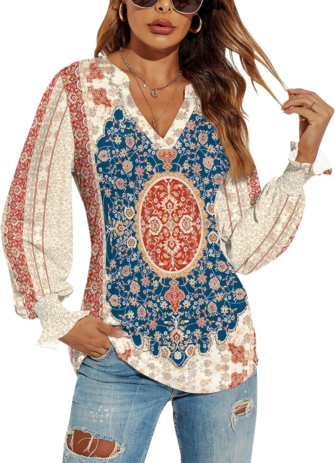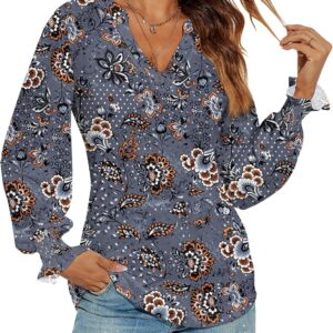 Romanstii Women’s Casual V-Neck T-Shirts Loose Puff Long Sleeve Tops Tunic Blouses