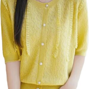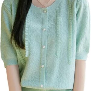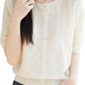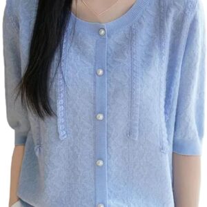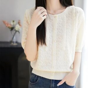 Women’s Elegant Lady Short Sleeve Knitted T-Shirt Thin Design Lace Edge Fashionable Women s Clothing Crew Neck Top