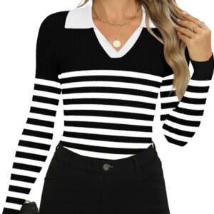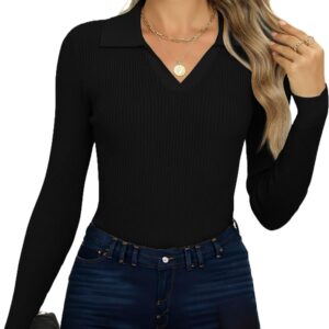 Womens Fall Sweater Tops Long Sleeve V Neck Collared Ribbed Knit Casual Shirts