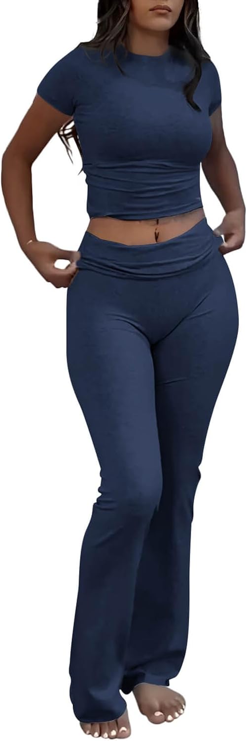 ZFLM Casual Workout Two Piece Outfits for Women Short Sleeve Crop High Waist Foldover Flare Pants Tracksuit Sets Streetwear